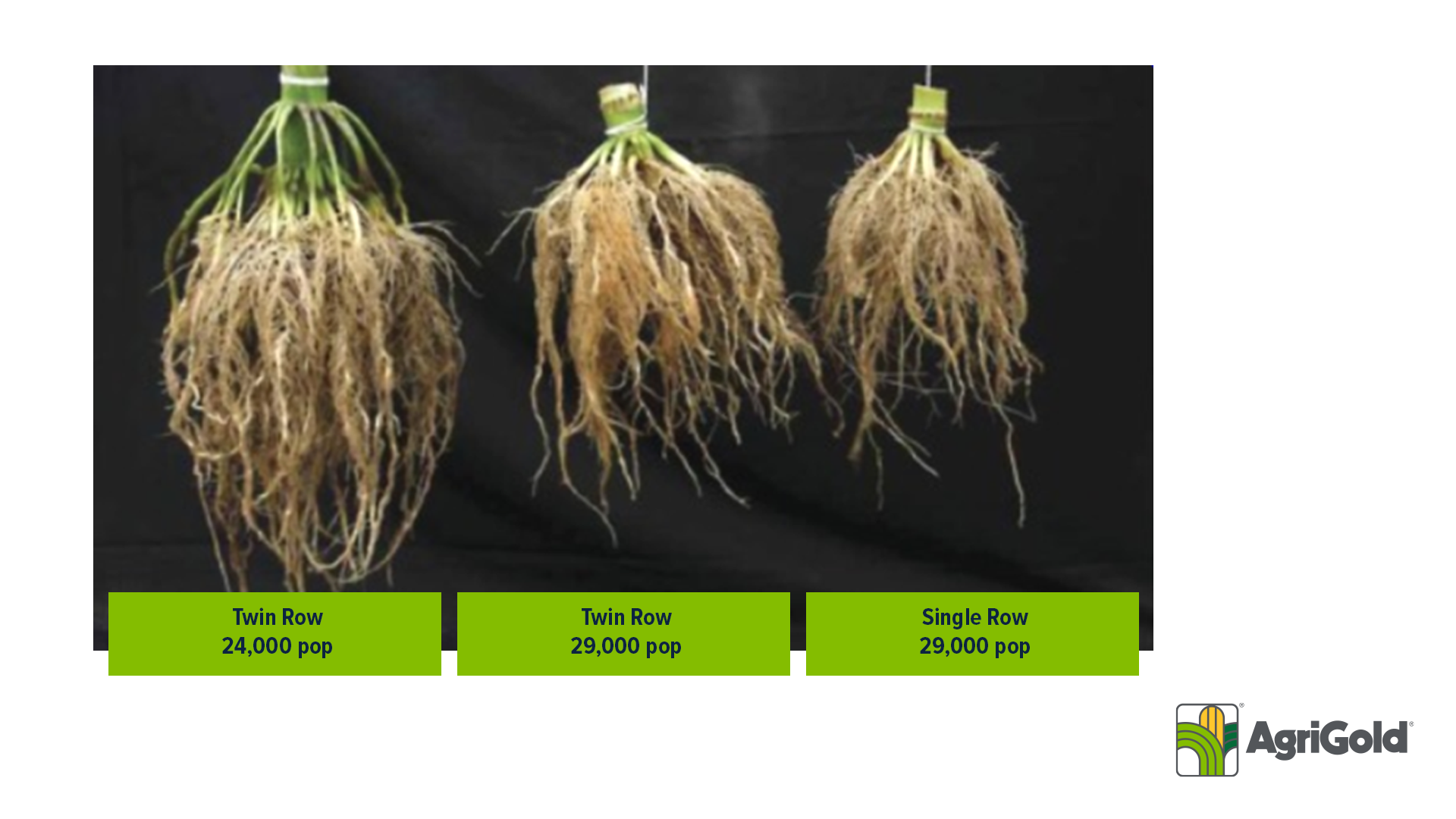 Planting corn in twin rows on 30-inch centers has the potential to increase yield by allowing better light interception. In Lloyd’s trials, twin row planting also led to higher root mass.